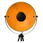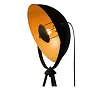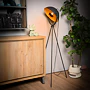 Třínohý ocelový stojan vysoký 134 cm drží půlkruhové stínidlo se zlatým vnitřkem, které dokonale spojuje moderní styl s útulnou atmosférou.