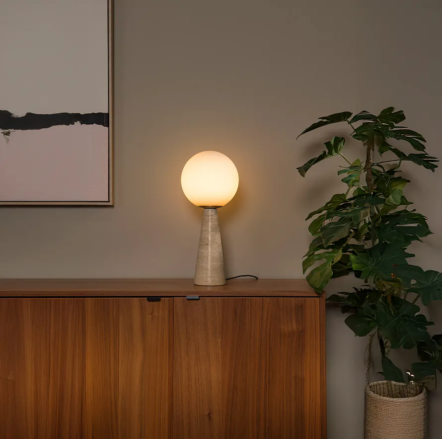 Evin je stolní lampa s mytickým vzhledem. Její základna z kuželovitého travertinového mramoru a matné kulovité stínidlo jí dodávají vzhled spíše artefaktu než obyčejné lampy. Přesto je Evin obojím – uměleckým kouskem i praktickým osvětlením. Díky kombinaci s úspornými LED žárovkami se skvěle hodí do každého moderního interiéru. Evin se bude vyjímat na odkládacím stolku, příborníku, v chodbě nebo na poličce. Praktický vypínač na kabelu umožňuje snadné zapnutí a vypnutí světla – a tím i vytvoření požadované atmosféry.