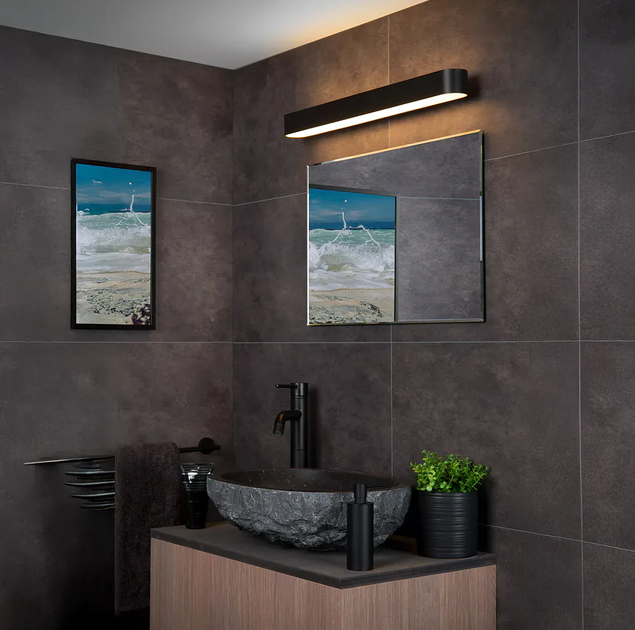 Černý kov a opálový akryl společně vytvářejí elegantní design, zatímco integrovaný světelný zdroj šíří do místnosti příjemné teplé bílé světlo, které se perfektně hodí nad koupelnové zrcadlo.