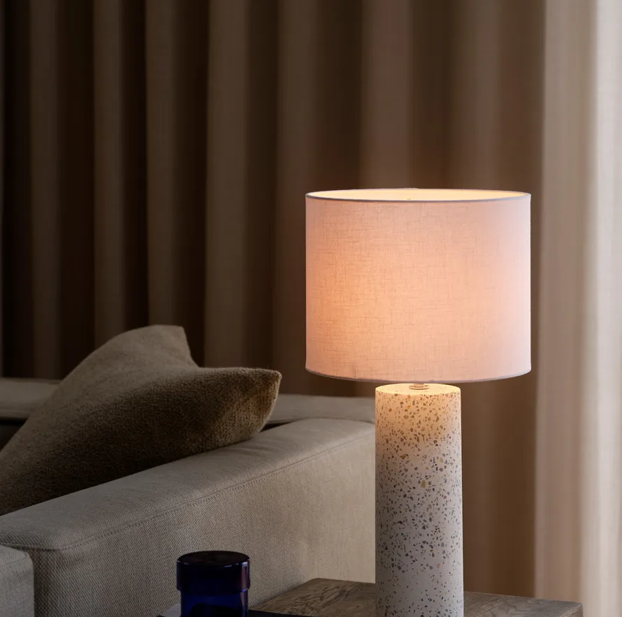 Díky textilnímu stínidlu rozptyluje světlo jemně a příjemně, takže se hodí jak do ložnice, tak i do obývacího pokoje a pracovny. Terrazzo základna dodává lampě špetku moderního šmrncu, který skvěle ladí s různými styly interiéru.