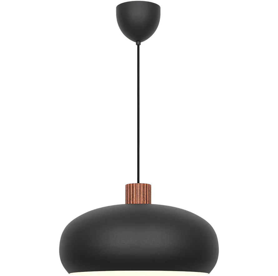 Čistý, minimalistický tvar z hrubého kovu doplňuje žebrovaný detail z tmavého dřeva, který mu dodává přírodní šmrnc. Světlo navíc jemně prosvítá i vrchním otvorem, což vytváří krásný efekt.