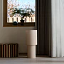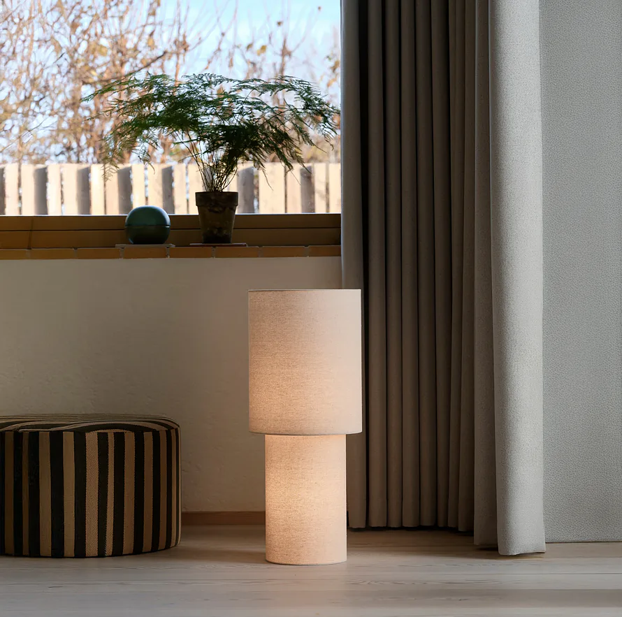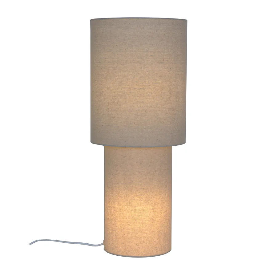 Lněné stínidlo vytváří jemné, rozptýlené světlo, zatímco světelné zdroje umístěné jak ve stínidle, tak v podstavci zajišťují rovnoměrné osvětlení shora dolů.