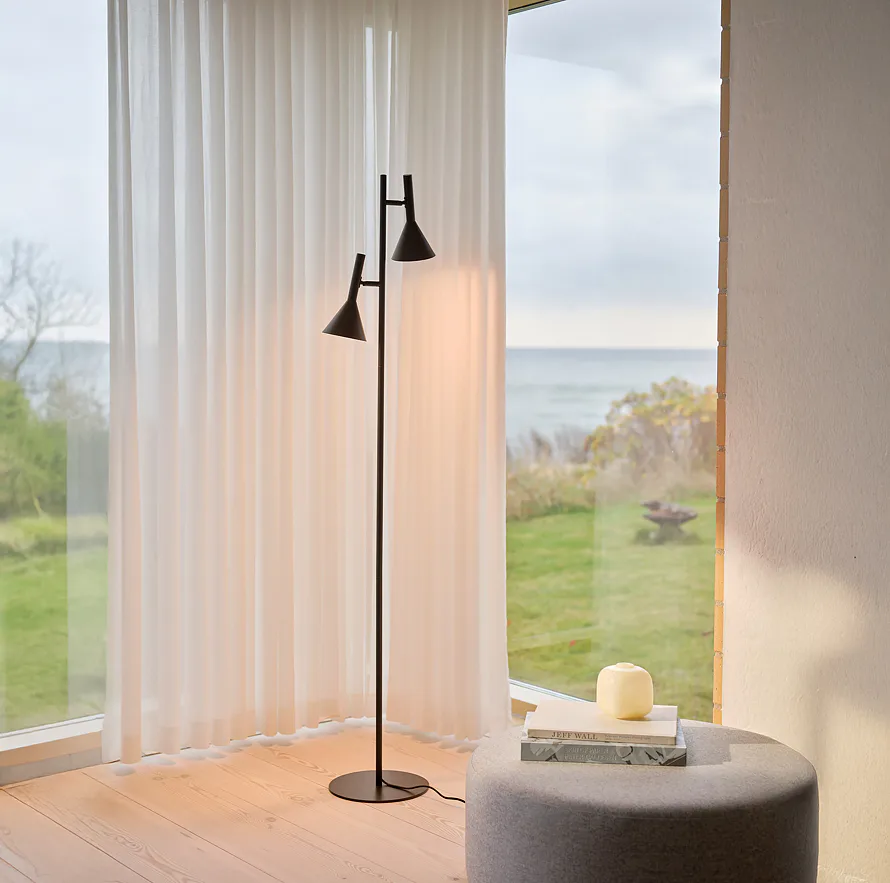 Kelvis má jednoduchý, minimalistický design se dvěma kuželovitými stínidly, která dodávají svítidlu elegantní a graficky čistý výraz.