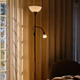 Tato elegantní stojací lampa kombinuje velké opálové stínidlo s menším flexibilním světlem na boku. Ideálně se hodí k pohovce nebo do čtecího koutku. Hlavní světlo rozjasní místnost, zatímco nastavitelné rameno vytvoří soustředěné světlo na čtení i práci.