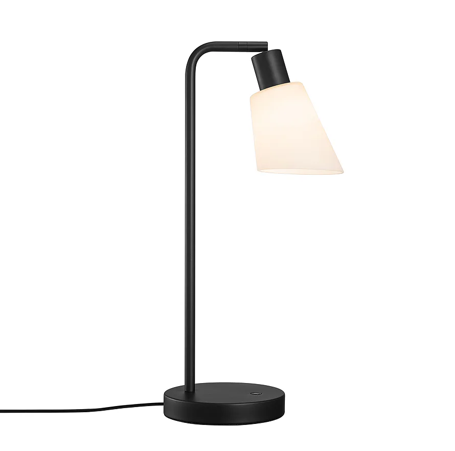 Stolní lampička ze série Molli od výrobce Nordlux je minimalistická a elegantní, bude skvělým doplňkem do Vašeho interiéru. Šikmé stínítko z matného bílého opálového skla v kombinaci s černým kovem tvoří skvělý pár a zajišťuje jemné rozptýlené světlo. Hlavu lampy můžete nastavovat, a tak se bude hodit do čtecího koutku nebo na noční stolek.