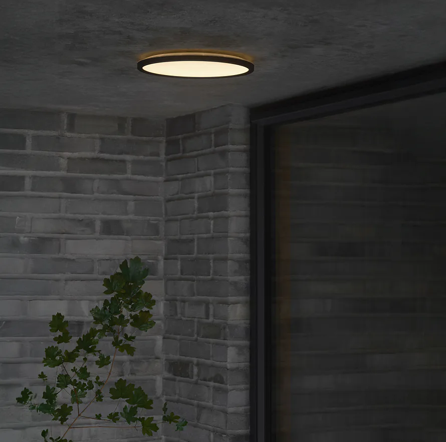 Oja je ultra tenké venkovní stropní svítidlo s elegantním, minimalistickým designem a vysokým stupněm krytí (IP54).