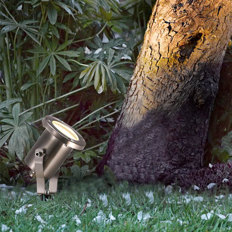 Jednoduchá venkovní bodovka Taurus z nerezové oceli. S možností nastavení úhlu světla, vhodné např. na nasvícení stromů či domu.
