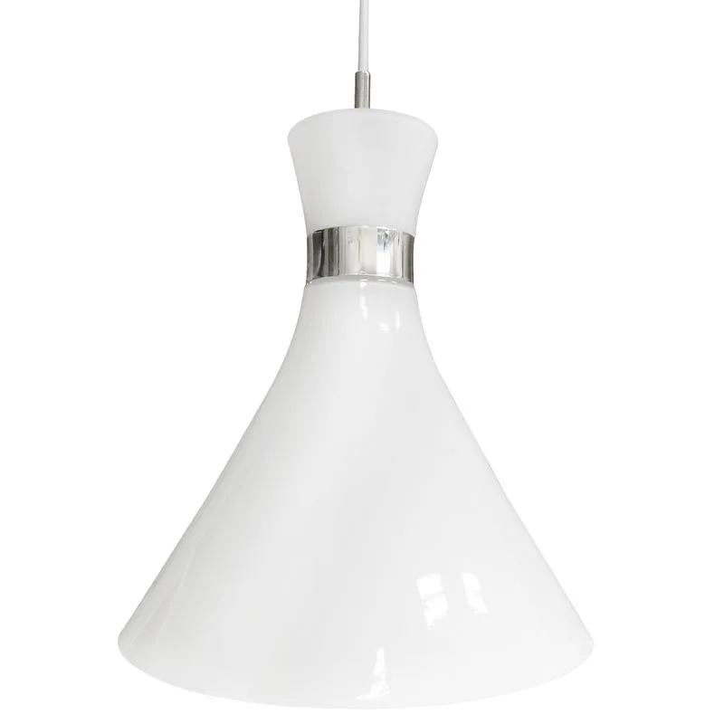 Příjemné tlumené světlo vám poskytne nadčasové závěsné svítidlo Trumpet díky stínidlu z opálového skla. Veselý tvar trumpety z bílého skla, doplněný o chromový kroužek vás nadchne v kuchyňském a jídlením prostoru.